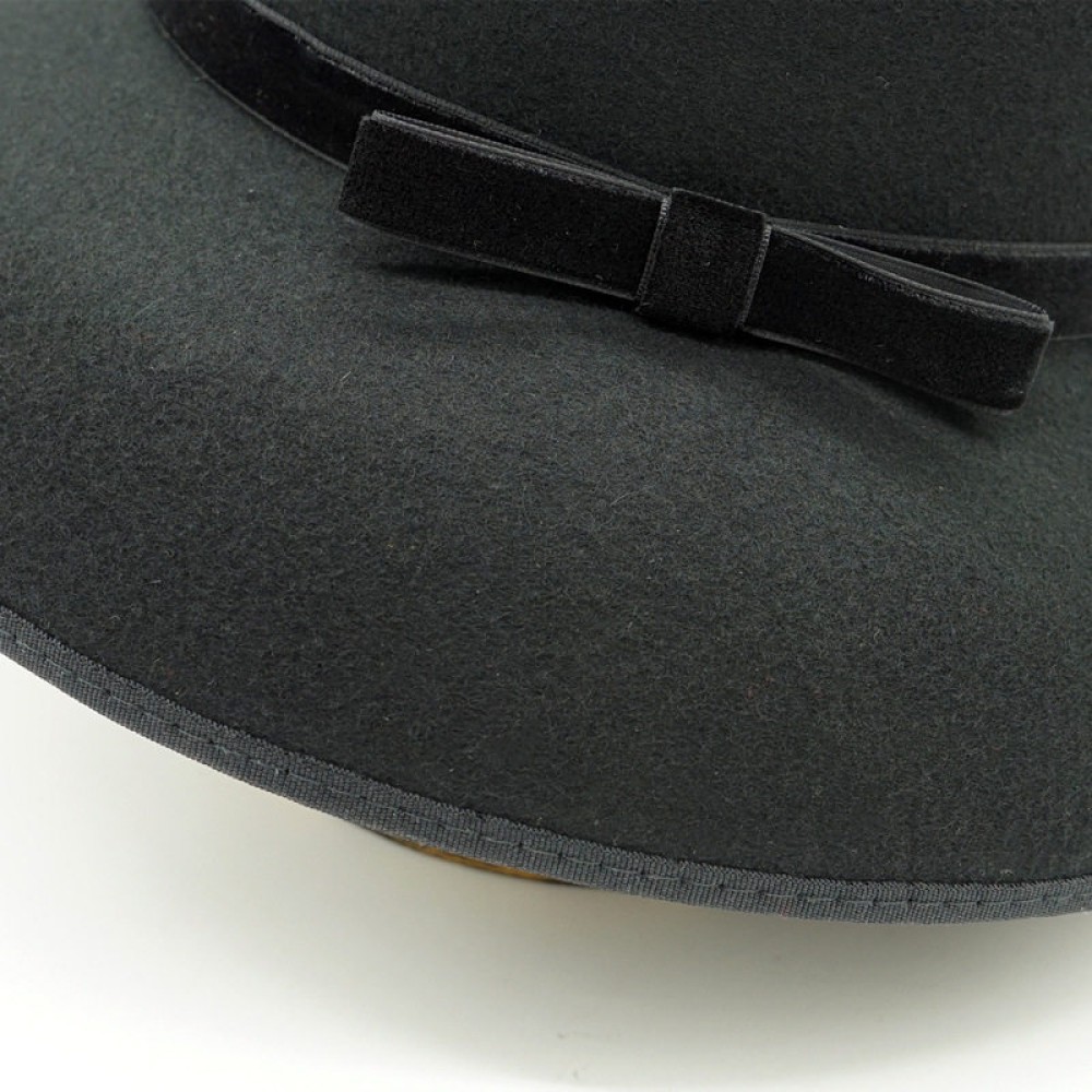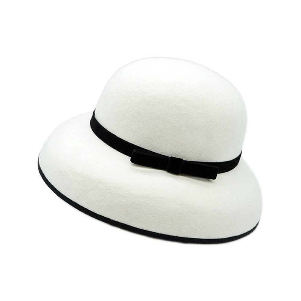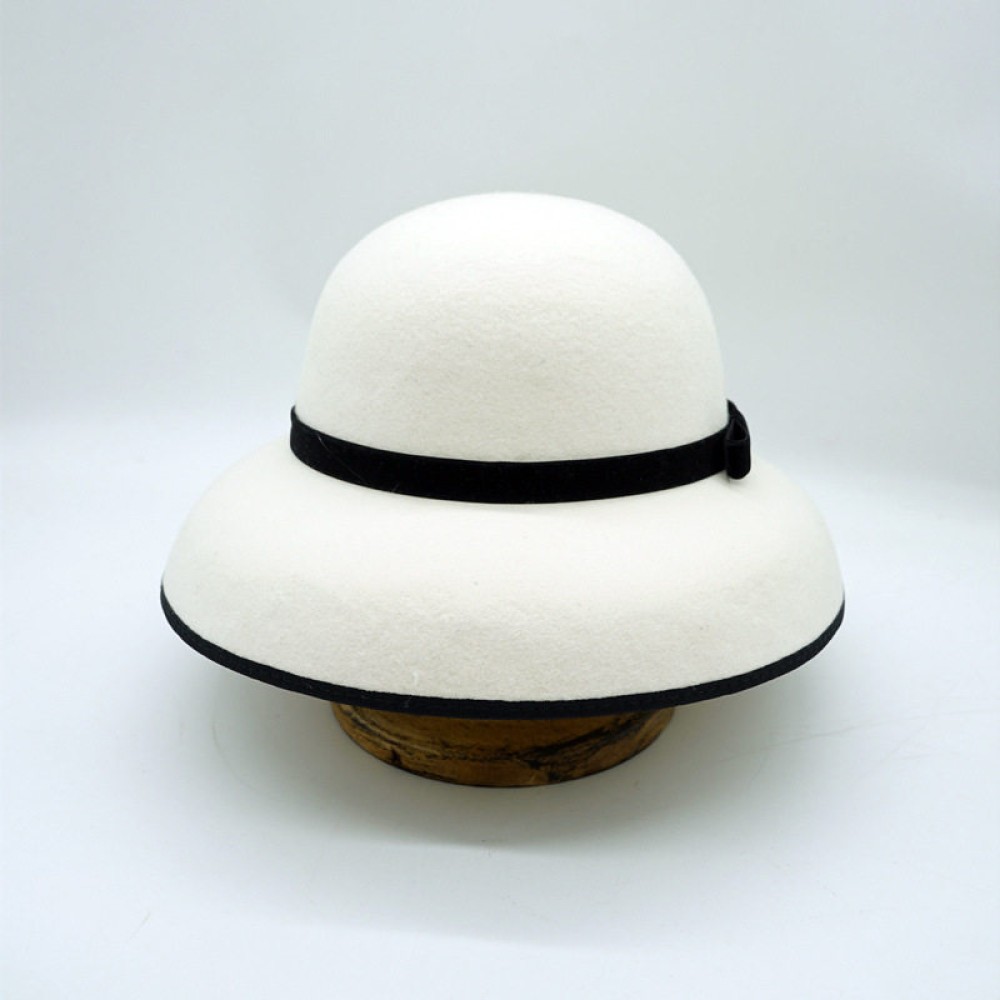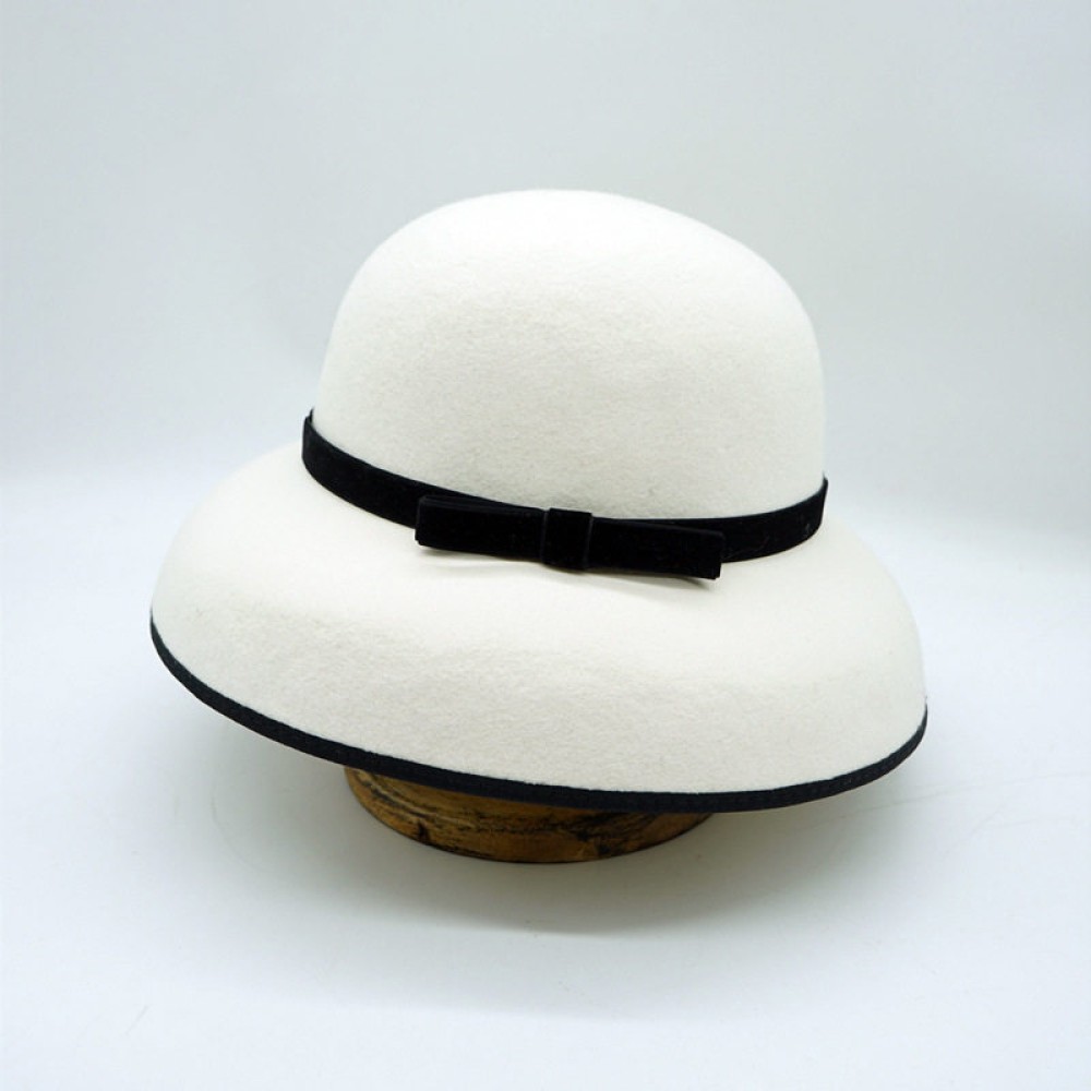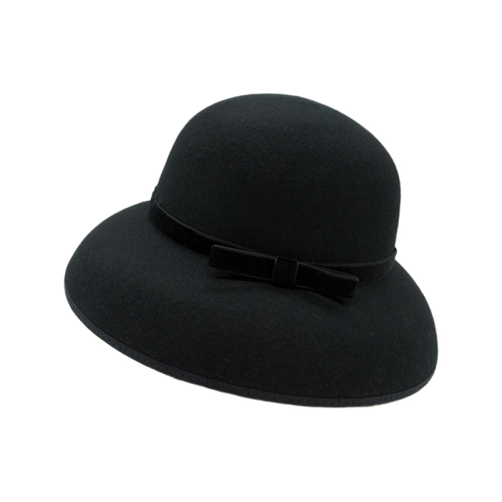 Key Features: Wide-brimmed round-top bell cloche shape, adorned with a slim velvet bow.